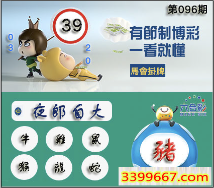096期正版彩图挂:39 爆:猪 挂牌成语:夜郎自大 挂牌出肖:牛鸡鼠猴龙蛇