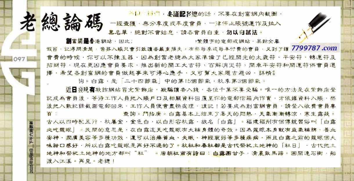 097期:六合皇金句/老总论码/萧公子/林大师/五行夺码/老总信箱截