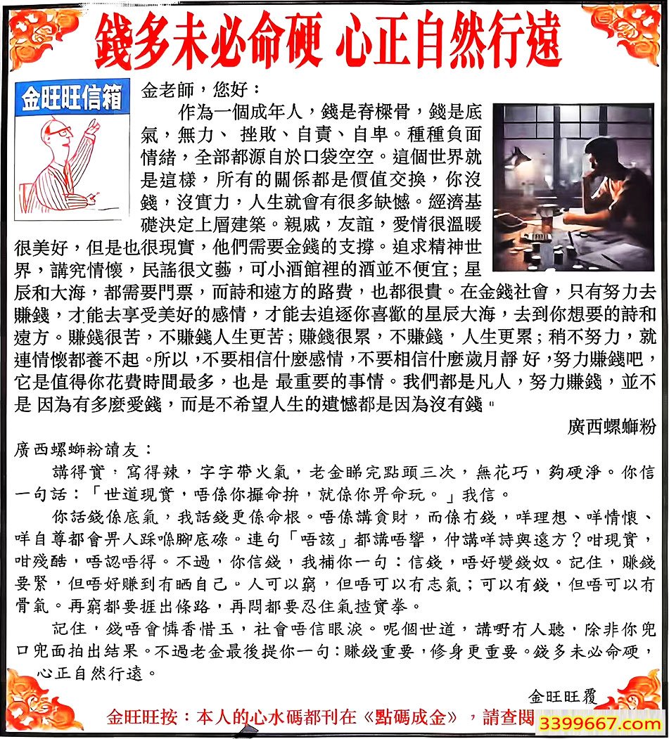 098期:金旺旺信箱彩民推荐→→《錢多未必命硬 心正自然行遠》
