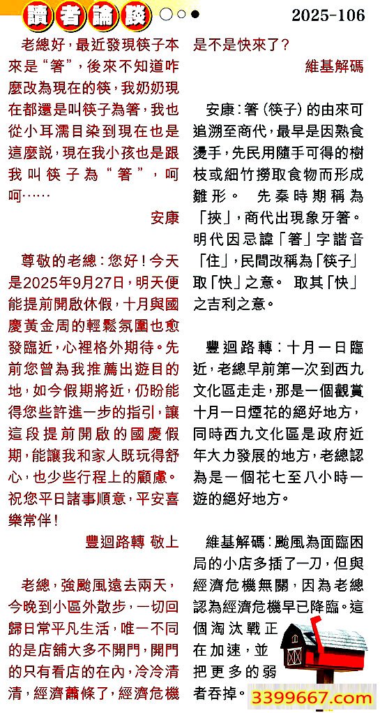 3.老總,強颱風遠去兩天,今晚到小區外散步,一切回歸日常平凡生活,唯一不同的是店鋪大多不開門,開門的只有看店的在內,冷冷清清,經濟蕭條了,經濟危機是不是快來了?====維基解碼