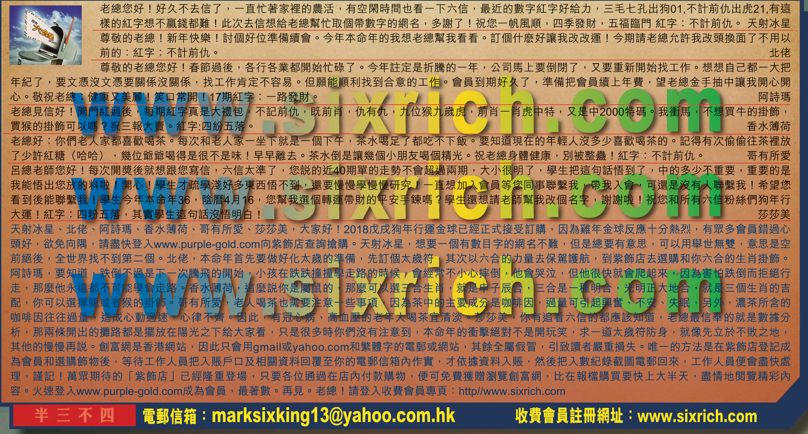 【6】呂總老師您好!每次開獎後就想跟您寫信,六信太準了,您説的近40期單的走勢不會超過兩期,大小很明了,學生把這句話悟到了,中的多少不重要,重要的是我能悟出您放的料啦!開心!學生才疏學淺好多東西悟不到,還要慢慢學慢慢研究!一直想加入會員等您同事聯繫我,帶我入會,可還是沒有人聯繫我!希望您看到後能聯繫我,學生今年本命年36,陰曆4月16,你幫我選個轉運帶財的平安手鏈嗎?學生還想請老師幫我改個名字,謝謝啦!祝你和所有六信粉絲們狗年行大運!紅字:四紛五落,其實學生這句話沒悟明白! ---莎莎美