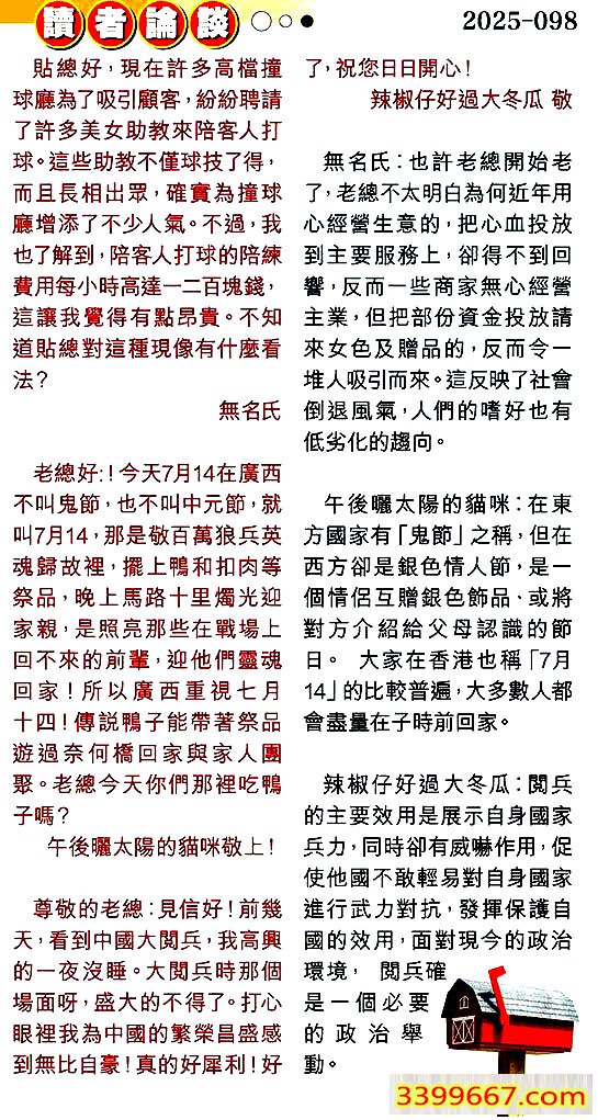 〖無名氏〗:也許老總開始老了,老總不太明白為何近年用心經營生意的,把心血投放到主要服務上,卻得不到回響,反而一些商家無心經營主業,但把部份資金投放請來女色及贈品的,反而令一堆人吸引而來。這反映了社會倒退風氣,人們的嗜好也有低劣化的趨向。