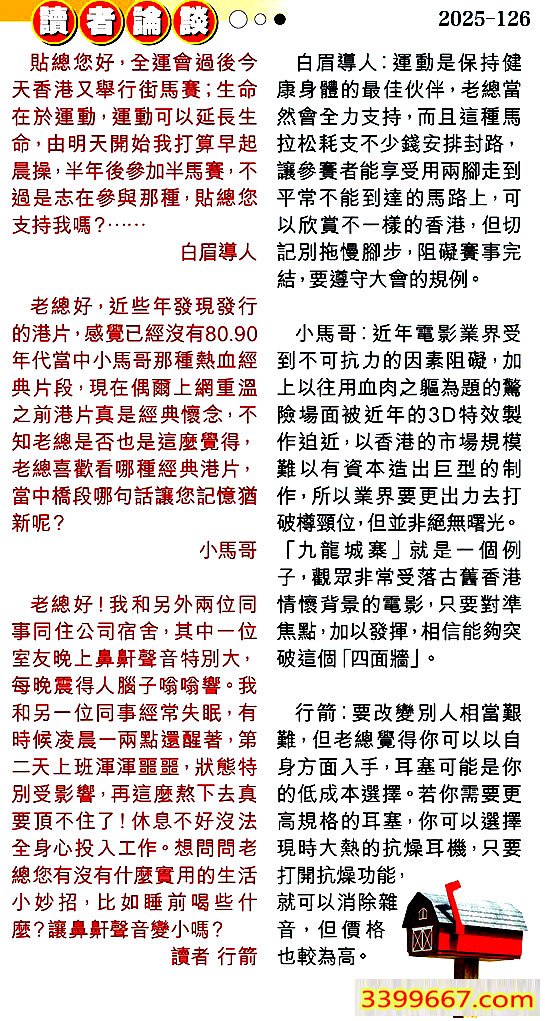 1.貼總您好,全運會過後今天香港又舉行街馬賽;生命在於運動,運動可以延長生命,由明天開始我打算早起晨操,半年後參加半馬賽,不過是志在參與那種,貼總您支持我嗎?......====白眉導人