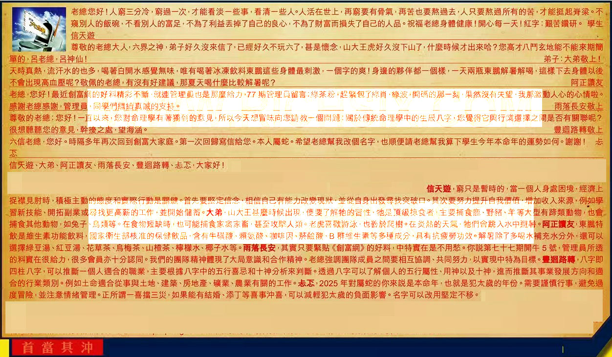 【6】.六信老總,您好。時隔多年再次回到創富大家庭。第一次回歸寫信給您。本人屬蛇。希望老總幫我改個名字,也順便請老總幫我算下學生今年本命年的運勢如何。謝謝!  忐忑