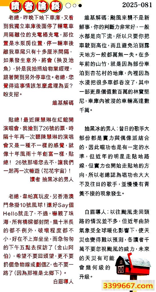 1.老總,昨晚下地下車庫,又看到我獨立車庫後面停了輛電車用隔離位的充電椿充電,那位置是水泵房位置,停一輛車後離我車尾只有十多厘米間隔,如果發生意外,將會(殃及池魚),於是我拍照給物業經理,跟著開到另外停車位。老總,您覺得這事情該怎麼處理為妥?盼支招。====維基解碼