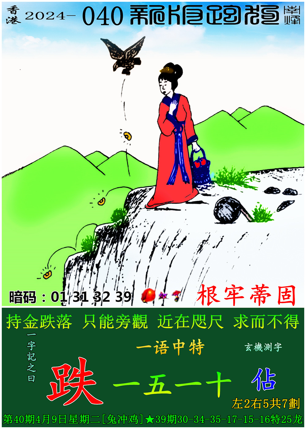 040期:新版跑狗一字記之曰【跌】 玄機測字:【佔】