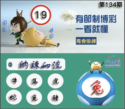 134期正版彩图挂:19 爆:兔 挂牌成语:纳谏如流 挂牌出肖:牛马虎蛇兔猪