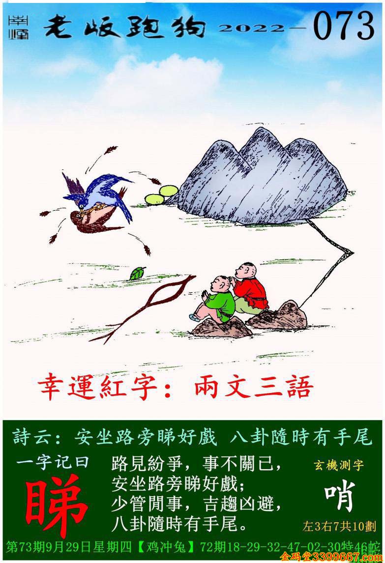 073期老版跑狗一字記之曰:【睇】玄機測字:《哨》