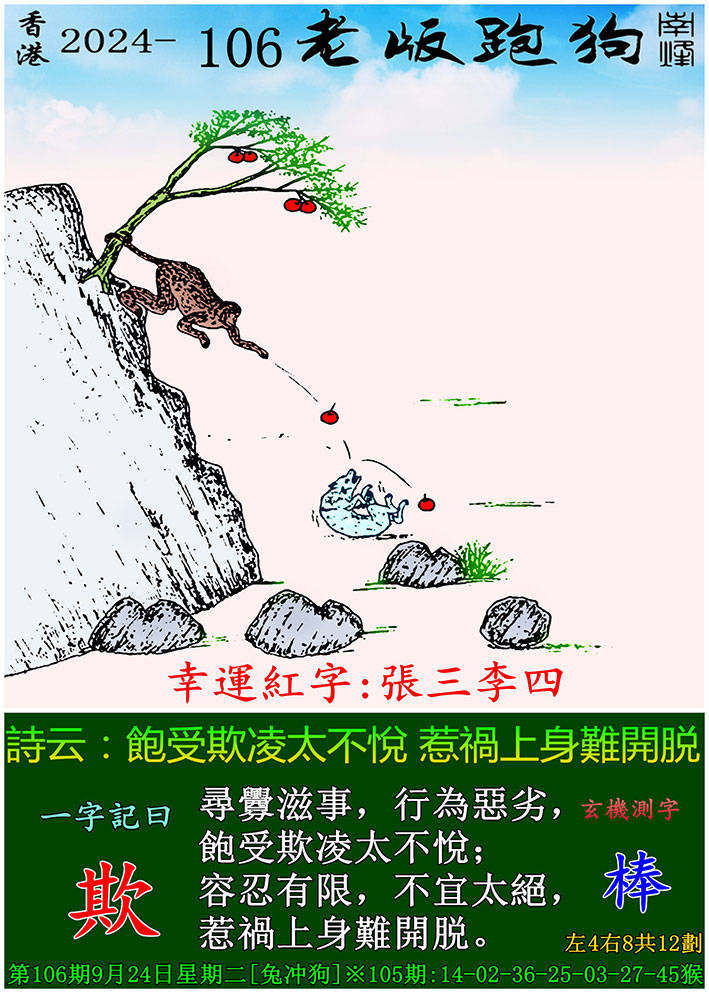 主题 : 106期老版跑狗一字記之曰:【欺】 玄機測字:《棒》