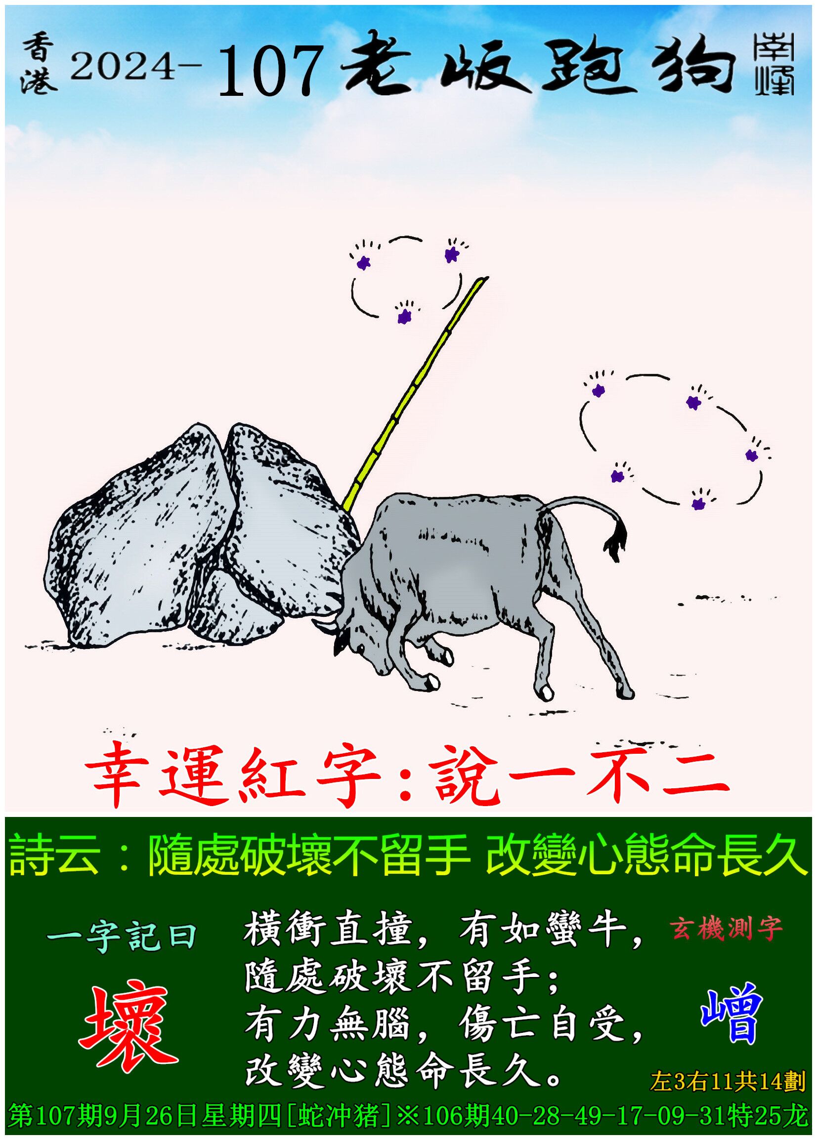 107期老版跑狗一字記之曰:【壞】 玄機測字:《嶒》