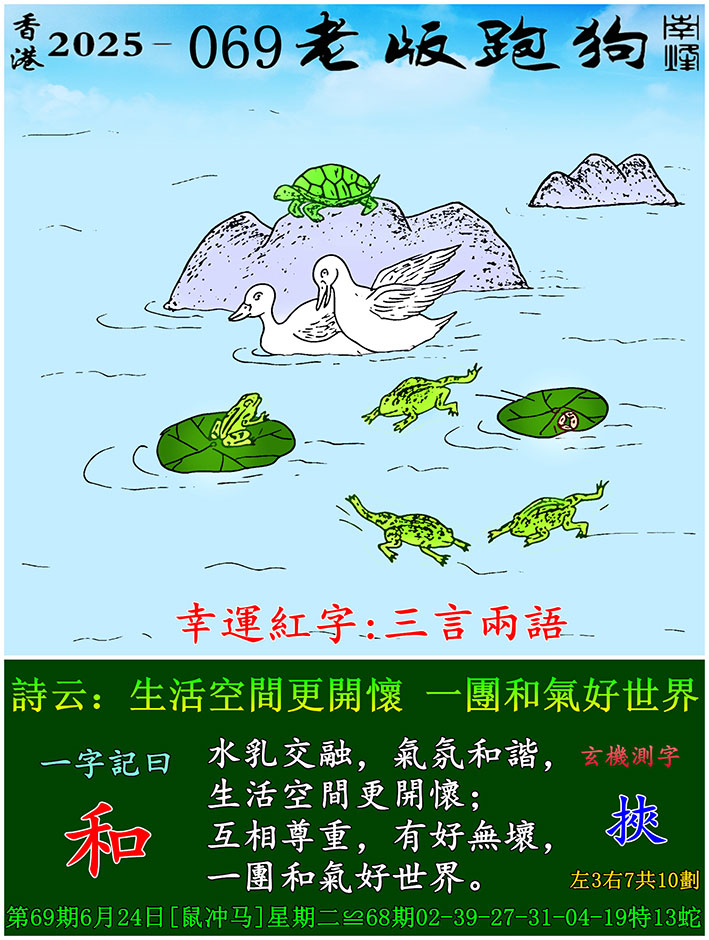 069期老版跑狗一字記之曰:【和】 玄機測字:《挾》