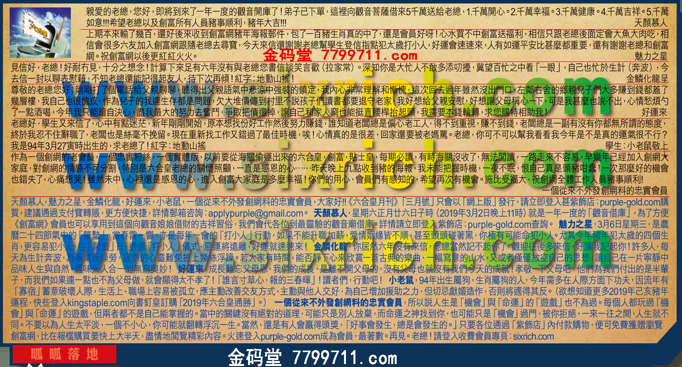 【2】上期本來輸了幾百,還好後來收到創富網豬年海報郵件,包了一百豬生肖真的中了,還是會員好呀!心水買不中創富送福利,相信只跟老總後面定會大魚大肉吃,相信會很多六友加入創富網跟隨老總去尋寶,今天來信還謝謝老總幫學生登信指點犯太歲打小人,好運會速速來,人有如運平安比甚麼都重要,還有謝謝老總和創富網。祝創富網以後更紅紅火火。 ---魅力之星