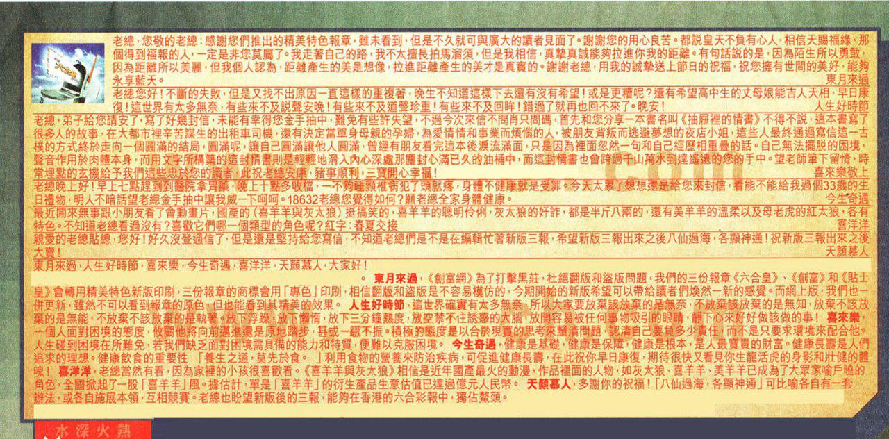 【6】親爱的老總貼總,您好!好久没登過信了,但是還是堅持給您寫信,不知道老總們是不是在編輯忙著新版三報,希望新版三報出來之後八仙過海,各顯神通!祝新版三報出来之後大賣! ---天颜慕人