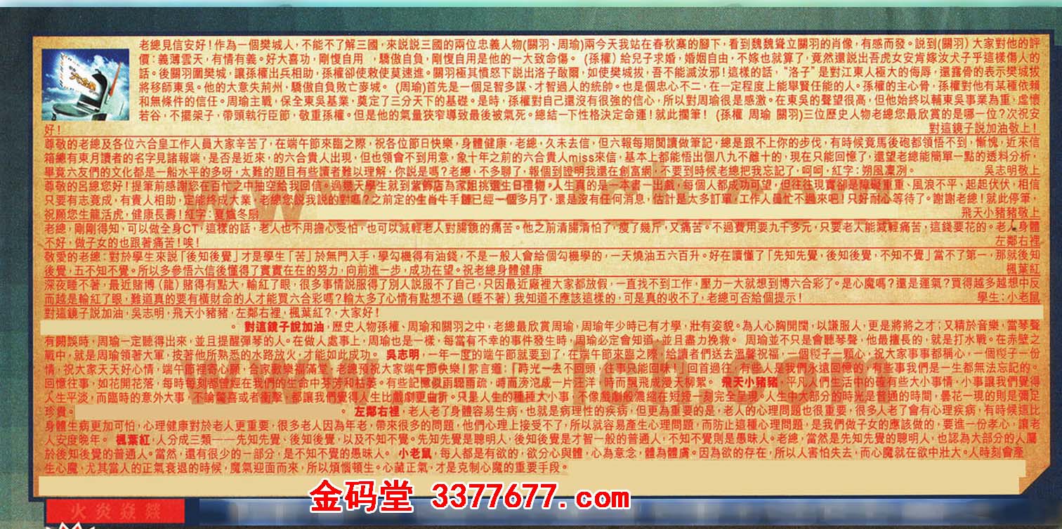 【1】老總見信安好!作為一個樊城人,不能不了解三國,來說說三國的兩位忠義人物(關羽、周瑜)兩今天我站在春秋寨的脚下,看到魏魏聳立关羽的肖像,有感而發。說到(关羽)大家對他的評價:義薄雲天,有情有義。好大喜功,刚愎自用,驕傲自負,刚愎自用是他的一大致命傷。(孫權) 給兒子求婚婚姻自由,不嫁 也就算了.竟然還说出吾虎女安肯嫁汝犬子 乎這樣傷人的話。後關羽圍樊城讓孫權出兵相助!孫權卻使敕使莫速進。羽羽極其愤怒下说出洛子敢爾,如使樊城拔,吾不能减汝邪這樣的話,“洛子”是對江東人極大的侮辱,還露骨的表示樊城拔將移師東吳。他的大意失荊州,驕傲自負敗亡麥城。(周瑜)首先是一個足智多謀、才智過人的統帥。也是個忠心不二,在一定程度上能舉賢任能的人。孫權的主心骨,孫權對他有某種依赖和無條件的信任。周瑜主戰,保全東吳基業,奠定了三分天下的基礎。是時,孫權對自己還沒有很強的信心,所以對周瑜很是感激。在東吳的聲望很高,但他始终以輔東吳事業為重,虚懷若谷,不擺架子,帶頭執行臣節,敬重孫權。但是他的氣量狹窄導致最後被氣死。總結一下性格決定命運!就此擱筆(孫權周瑜開羽)三位歷史人物老總您最欣赏的是哪一位?次祝安好! ---對這镜子說加油敬上!