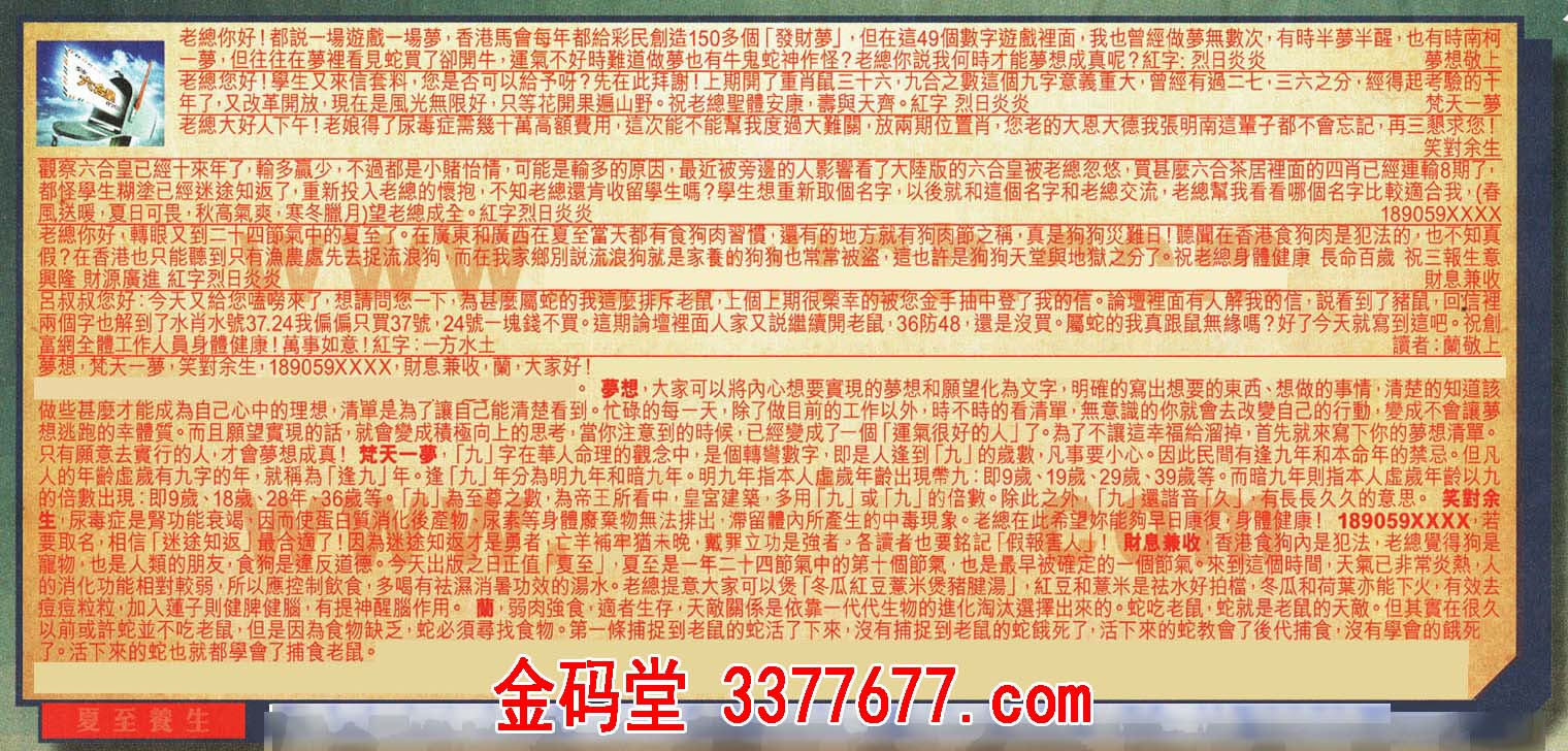 【1】老總你好!都說一場遊戲場夢,香港馬會每年都給彩民創造150多個「發財夢」, 但在這49個數字遊戲裡面;我也曾經做夢無數次,有時半夢半醒,也有時南柯夢,但往往在夢裡看 見蛇買了卻開牛,運 氣不好時難道做 夢也有牛鬼蛇神作怪?老總你說我何時才能夢想成真呢?紅字:烈日炎炎 ---夢想敬上