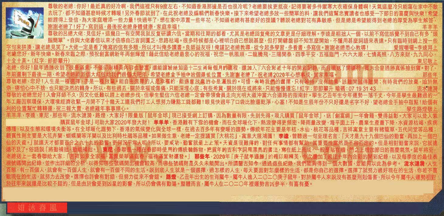 【4】老總,你好!鼠年通勝收到了很是滿意,不僅印刷精美内容也豐富還能讓粉絲知道十二生肖每個月的運程還加入了六合彩近十年的開彩記錄,而且還送了開運符買六合皇通勝真系撿到寶。對了,年前還剩下最後一期,希望老總能派個大紅包給我們過個大肥年,希望老總金手抽中放個最佳位置先謝謝老總了,祝老總2020年心想事成;闔家幸福。-----那些年