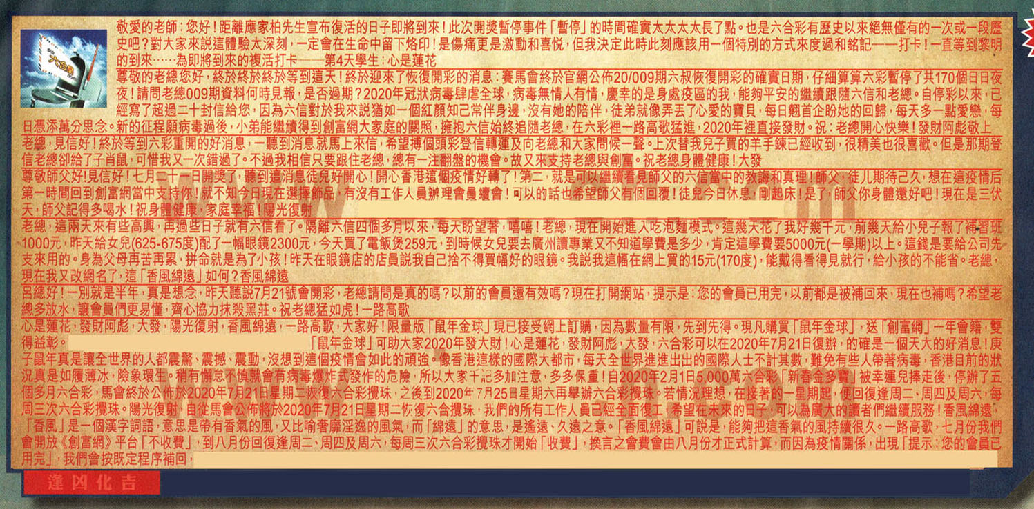 【2】.尊敬的老總您好,終於終於終於等到這天!終於迎來了恢復開彩的消息:賽馬會終於官網公佈20/009期六叔恢復開彩的確實日期,仔細算算六彩暫停了共170個日日夜夜!請問老總009期資料何時見報,是否過期?2020年冠狀病毒肆虐全球,病毒無情人有情,慶幸的是身處疫區的我,能夠平安的繼續跟隨六信和老總。自停彩以來,已經寫了超過二十封信給您,因為六信對於我來説猶如一個紅顏知己常伴身邊,沒有她的陪伴,徒弟就像弄丟了心愛的寶貝,每日翹首企盼她的回歸,每天多一點愛戀,每日憑添萬分思念。新的征程願病毒過後,小弟能繼續得到創富網大家庭的關照,擁抱六信始終追隨老總,在六彩裡一路高歌猛進,2020年裡直接發財。祝:老總開心快樂! 發財阿彪敬上