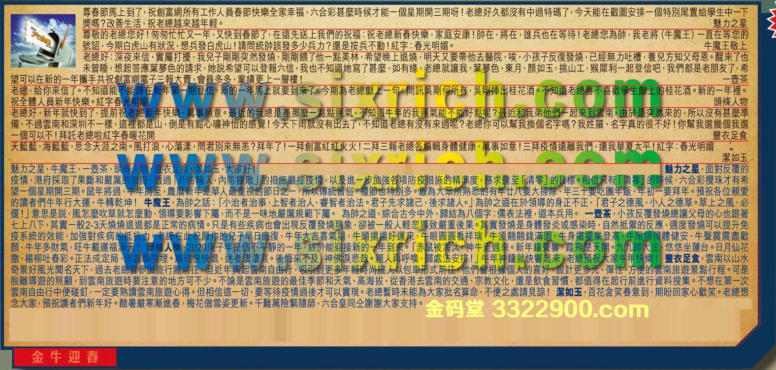 →〖魅力之星〗:面對反覆的疫情,港府採取了果斷和嚴厲的措施,透過「外防输入、內防擴散」的措施嚴控疫情,以及進一步加強各項防疫措施的精準度,務求達至「清零]的目標。相信只有「清零」的時候,六合彩攪珠才有希望一個星期開三期。鼠年將過,牛年將至,農曆新年是華人最重視的節日之一,所以傳統習俗、禮節也特別多。最為大眾所熟悉的有年廿八要大掃除、年三十要吃團年飯、年初一要拜年。預祝各位親愛的讀者們牛年行大運、牛轉乾坤!