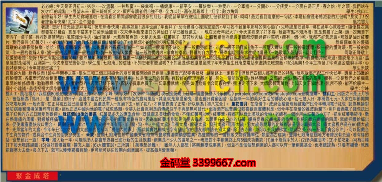 【1】.老老總:今天是正月初三,送你,一次溫馨,一包甜蜜。一袋幸福,一桶健康。一箱平安,一籮快樂。一粒愛心,一分牽掛。一分關心,一分疼爱。一分現在是正月,春之始,年之頭,我們站在2021年的起點上,展望未來,願三報紅紅火火,願所有讀者們自強不息,全力以赴,赢在起跑線上!紅字:敵力角氣  學生:挑山工