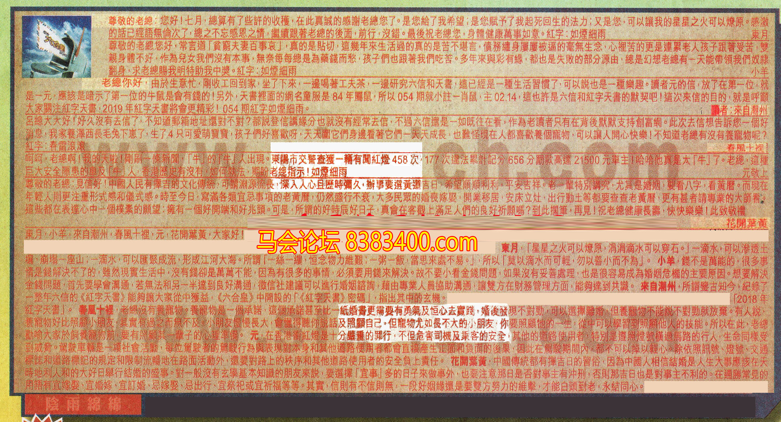 【3】.老總你好,由於生意忙,剛收工回到家,坐了下來,一邊喝著工夫茶,一邊研究六信和天書,這已經是一種生活習慣了,可以說也是一種樂趣。讀者元的信,放了在第一位,就是一元,應該是暗示了第一位的牛鼠是會有錢的!另外,天書裡面的網名童服是84年屬鼠,所以054期就小註一肖鼠,主02.14,這也許是六信和紅字天書的默契吧!這次來信的目的,就是呼籲大家關注紅字天書,2019年紅字天書將會更精彩!054期紅字如煙細雨。     讀者:來自潮州