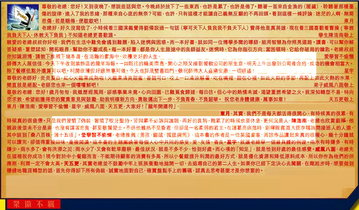 【4】.師傅大人展信佳:今天下午收到紫飾店的龍年海報。一如既往的精美漂亮。開心之際又接到餐飲公司的單生意。明天上午出發到公司看合約,成功的機會相當大。除了餐標低點外還算可以吧。利潤很薄但好過無事可做。今天也算是雙臨門。敬祝師傅大人喜樂安康,一切順遂! 星宇