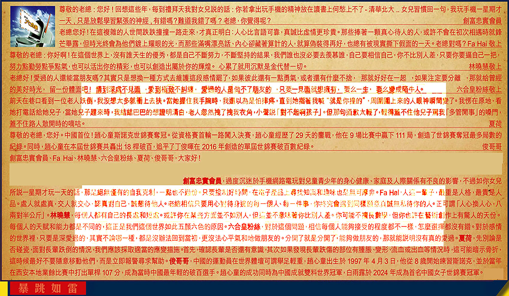 【1】.尊敬的老總:您好!回想這些年,每到禮拜天我對女兒說的話:你若拿出玩手機的精神放在讀書上何愁上不了 - 清華北大..女兒習慣回句,我玩手機星期才二天,只是放鬆學習聚張的神經,有錯嗎?難道我錯了嗎?老總你覺得呢?  創富忠實會員