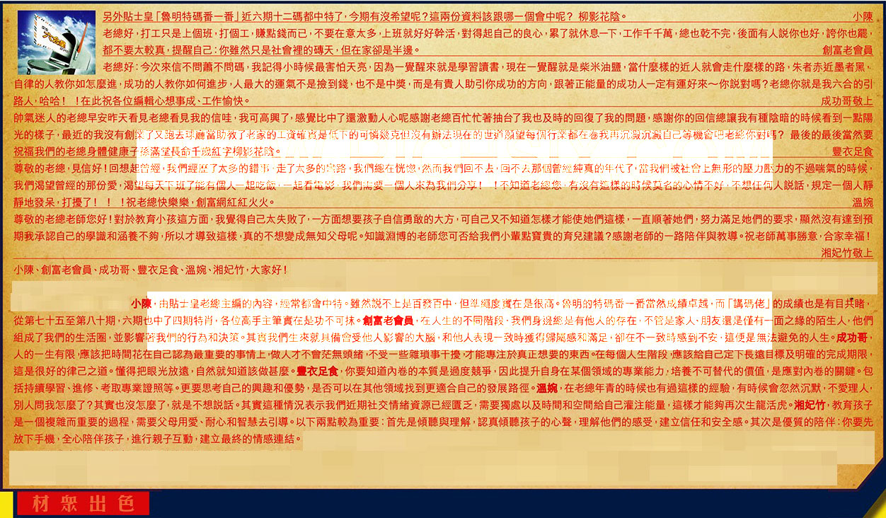 →〖小陳〗:由貼土皇老總主編的內容經常都會中特。雖然說不上是百發百中,但準繩度實在是很高。魯明的特碼番一番當然成績卓越,而「講碼佬」的成績也是有目共睹,從第七十五至第八十期,六期也中了四期特肖,各位高手主筆實在是功不可抹。