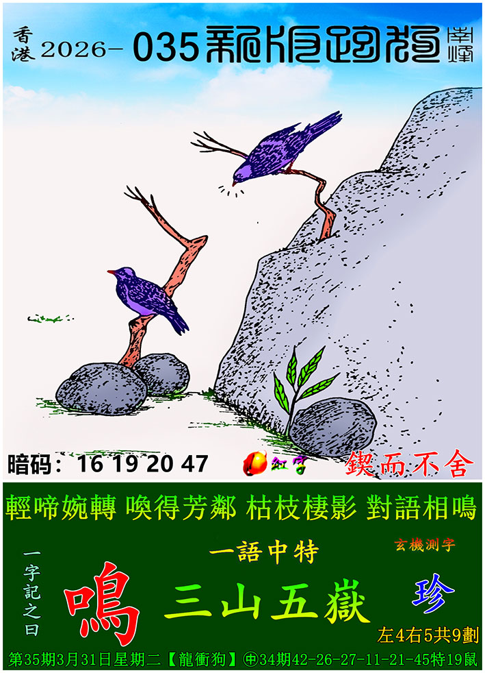 035期:新版跑狗一字記之曰【鳴】 玄機測字:【珍】