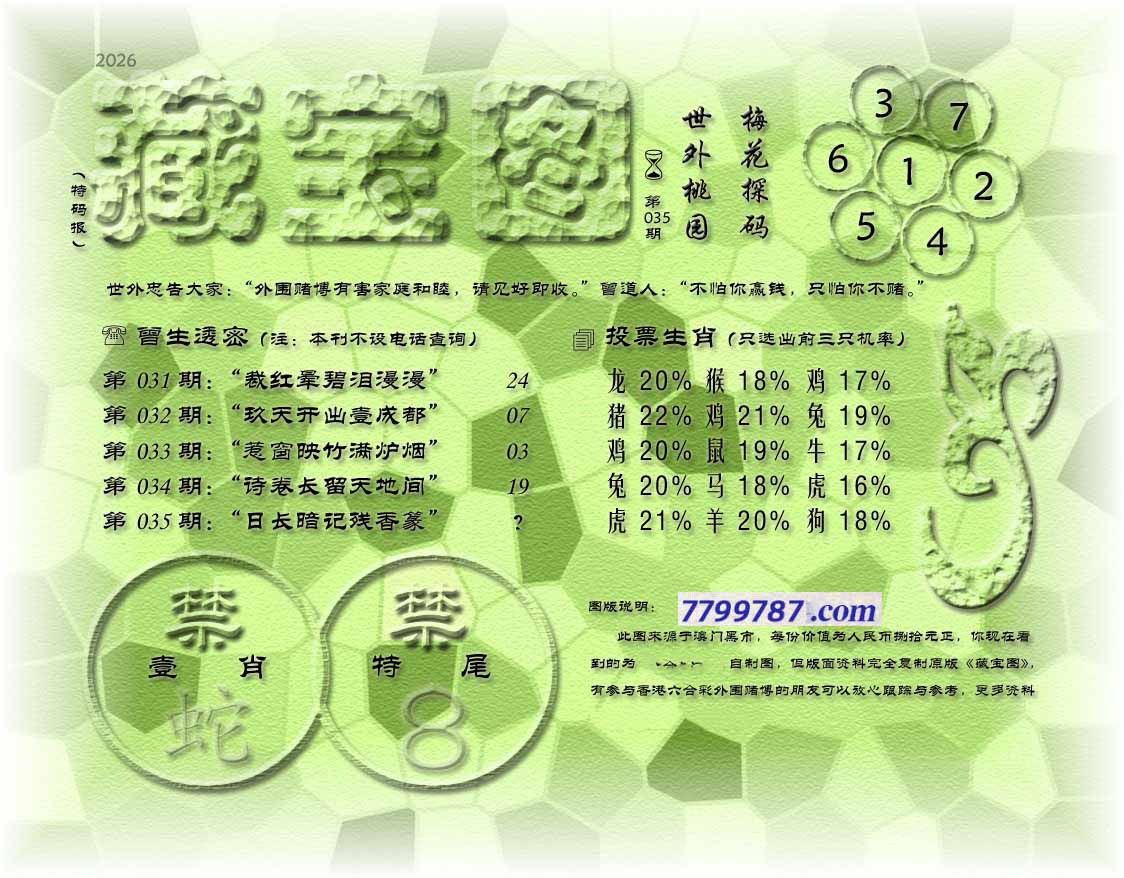 035期藏寶圖 新:蕉留庭户因供字 老:日长暗记残香篆 禁:蛇 禁:8尾 玄機字:《渐》