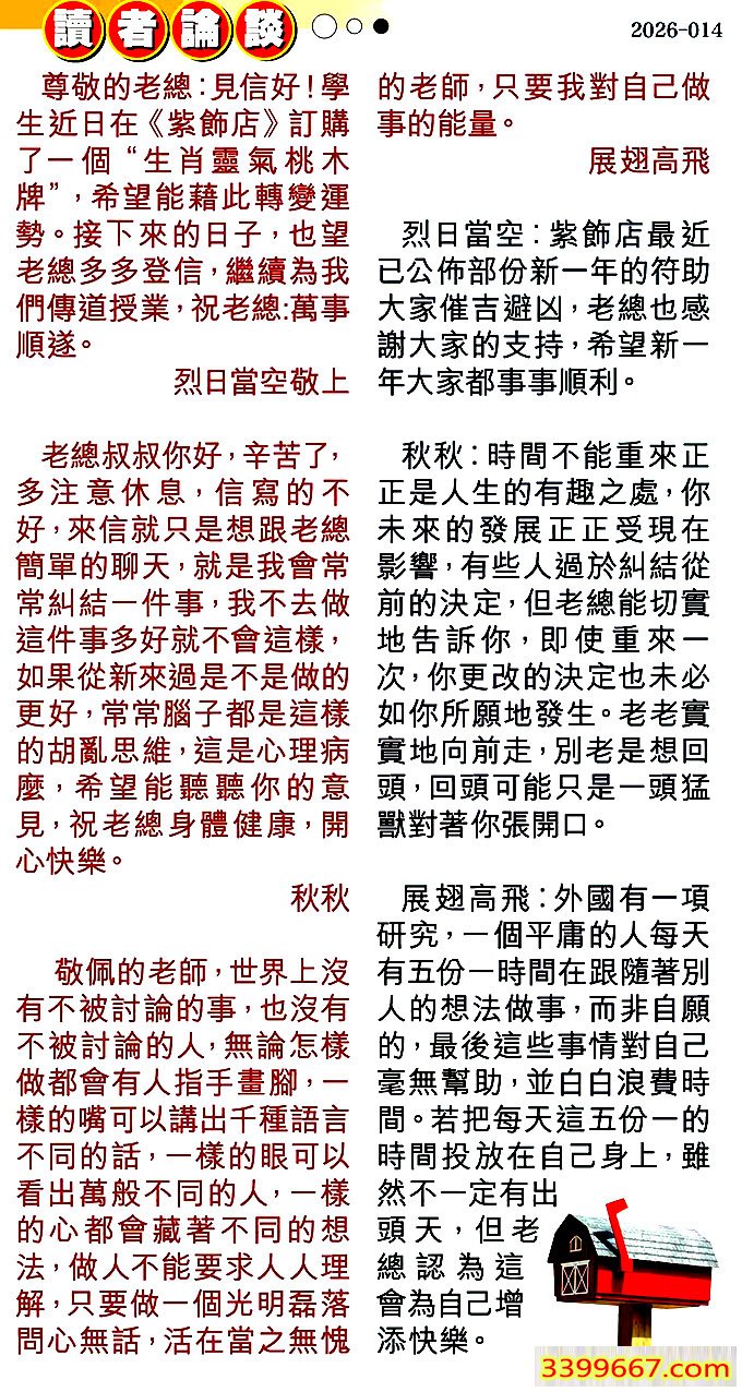 014期:彩民推荐〖貼信讀者論壇〗